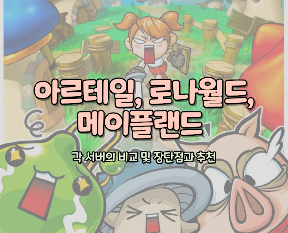 안녕하세요, 요즘에 빅뱅 전 메이플스토리에 추억을 느끼고 싶어서 메이플월드 서버를 알아보시는 분들이 많으신 것 같아요. 게임 서버 선택에 도움이 되고자 아르테일, 로나월드, 메이플랜드 서버에 대한 개인적인 분석을 공유하고자 합니다. 이 글을 통해 그 당시에 매콤했던 메이플을 다시 시작하실 때 참고하시면 좋을 것 같습니다!각 서버의 장단점을 알아보고, 게임 스타일에 맞는 서버를 선택하는 데 도움이 되길 바랍니다!